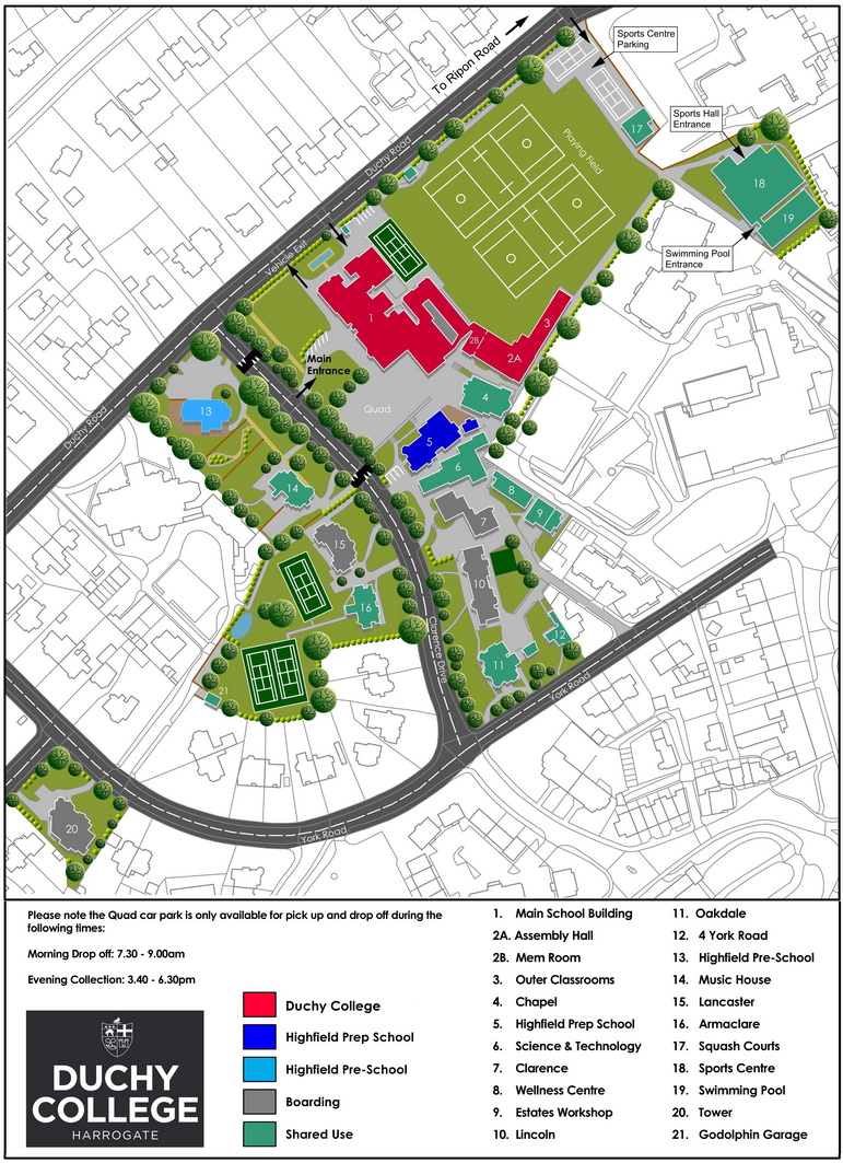 เดิม Duchy College มีชื่อว่า Harrogate Ladies’ College ก่อตั้งขึ้นในปี 1893 ซึ่งมีอายุมากกว่า 130 ปี เป็นหนึ่งในโรงเรียนมัธยมเอกชนชั้นนำใน UK ที่ยังคงความเป็น British สำหรับนักเรียนอายุระหว่าง 11 – 18 ปี ที่มีทั้งนักเรียนอยู่ประจำ (ฺBoarding school) และไม่ประจำ (Day school) และเปิดรับนักเรียนต่างชาติเข้าไปเรียนร่วมกับนักเรียน UK โรงเรียนแห่งนี้ตั้งอยู่ในเมือง Harrogate ซึ่งอยู่ทางตอนเหนือของ UK (North Yorkshire) ใกล้กับเมือง Leeds, Bradford และ York โดยสามารถเดินทางจาก London ด้วยรถไฟสายตรงในเวลาประมาณ 2 ชั่วโมงครึ่ง หรือด้วยรถยนต์ในเวลาประมาณ 5 ชั่วโมง หรือเดินทางไปยัง Manchester Airport ในเวลาประมาณ 90 นาที หรือเดินทางไปยัง Leeds Bradford airport ในเวลาประมาณ 15 นาที