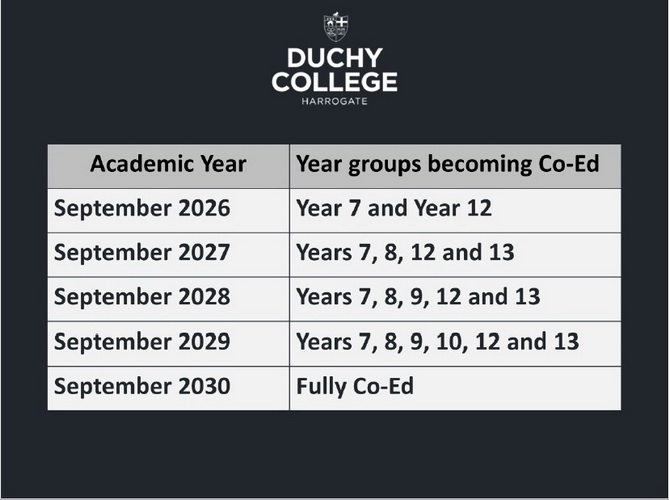 ในภาคเรียน September 2026 Harrogate Ladies’ College เปลี่ยนการรับนักเรียนจากโรงเรียนสตรีล้วนเป็นโรงเรียนสหศึกษา และเปลี่ยนชื่อเป็น Duchy College โดยจะรับนักเรียนชายเข้าเรียนในระดับ Year 7 และ Year 12 และจะทยอยรับนักเรียนชายเข้าเรียนเพิ่มในระดับอื่นในปีต่อ ๆ ไป ดังนี้