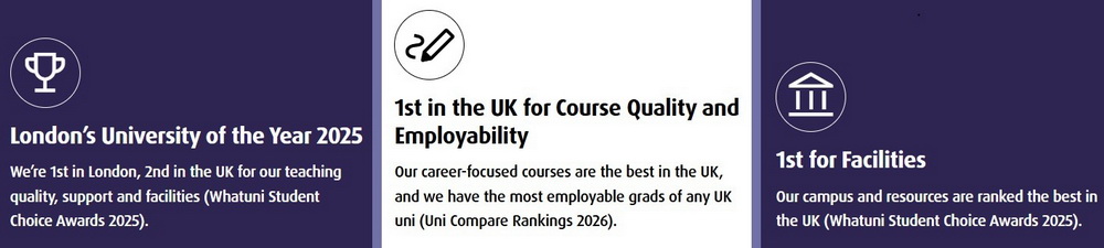 – London’s University of the Year 2025 and 2nd in the UK for teaching quality, support and facilities (Whatuni Student Choice Awards 2025)