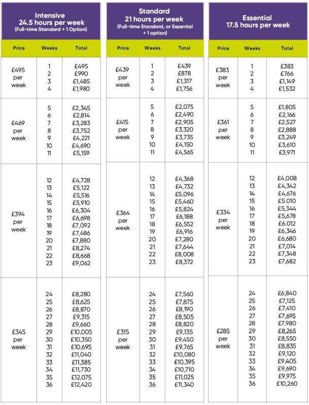 – Materials Fee: 1-3 weeks £45 / 4-8 weeks £55 / 9-12 weeks £70 / 13-23 weeks £85 / 24-35 weeks £95 / 36 weeks and over £110